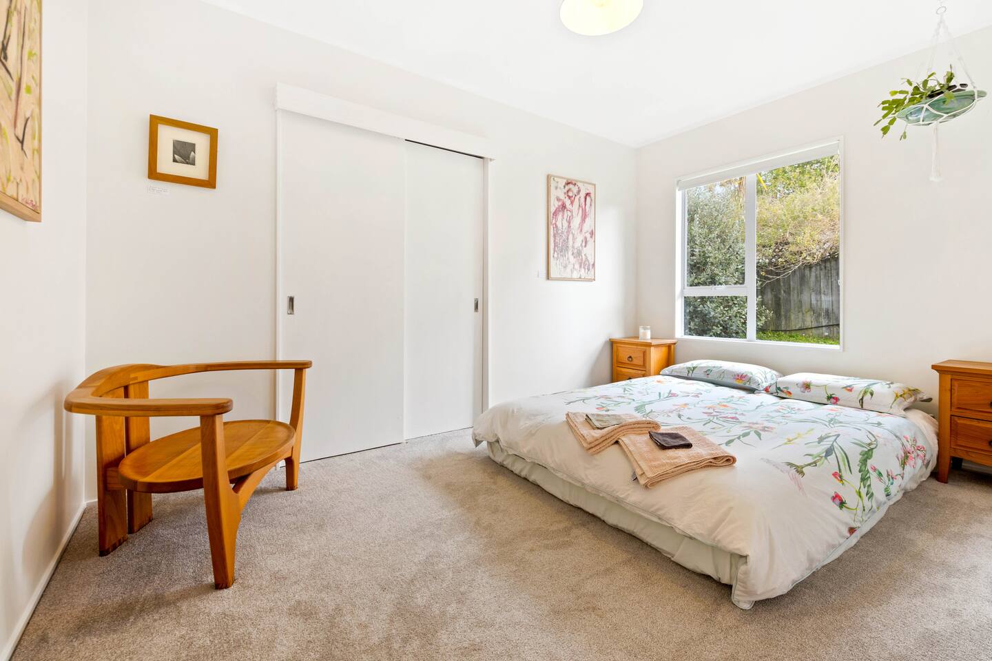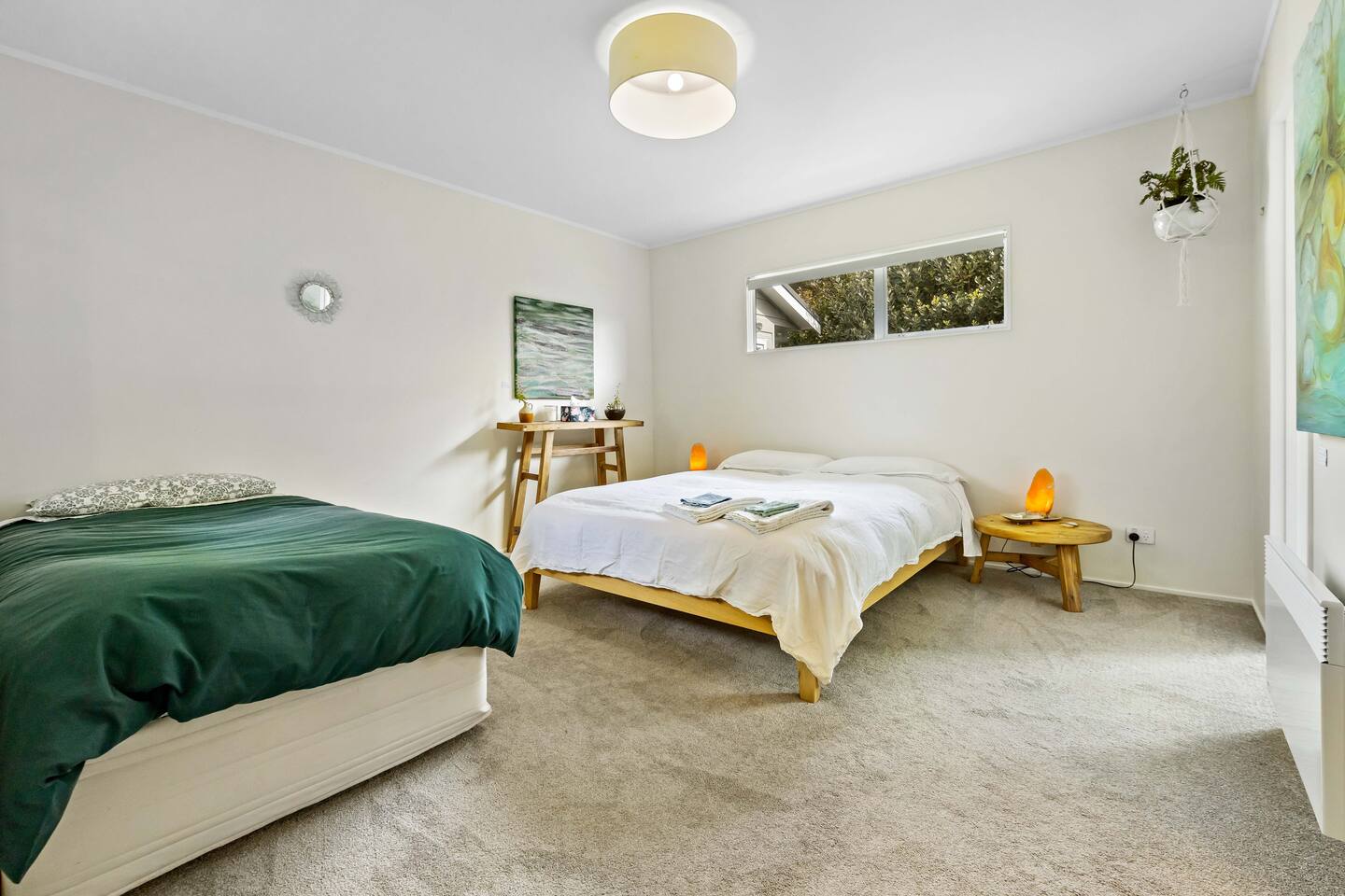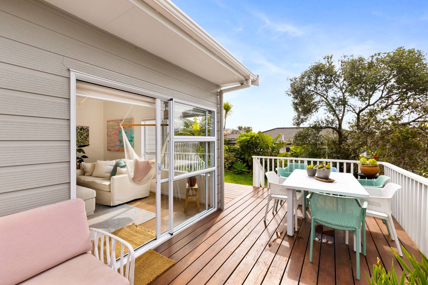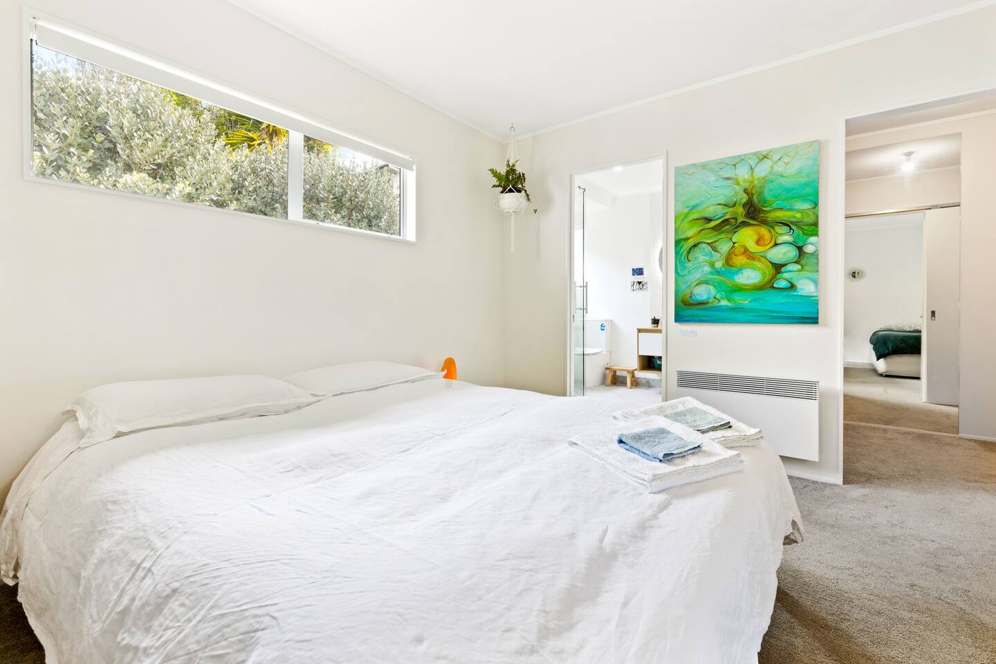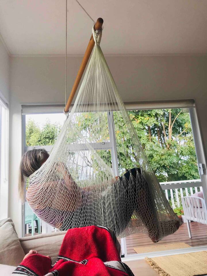 A warm welcome to Peaceful Oasis in the heart of Stanmore Bay! by baybeautifulretreats. This private home has been divided into two separate apartments. The north facing front area of the house is the guest apartment, and Louise lives in the back apartment of the house which has its own separate entrance. Pets (especially dogs!) are most welcome! but please be sure that you take full responsibility for all their home and garden maintenance! The house is spacious and fully set up for short and longterm stays. It can also be hired out, (on a separate hourly basis) and works well for special events, meetings, retreats and classes. Please let us know how we can help you best, to make your stay as exceptional as it could be! The house showcases Louise Taylor Art. All the artwork is for sale, and commissions are welcome, let us know if something interests you. As you can see in the photos we love our mayan silk hammocks and recliner hammock chairs. They are super comfortable. Let us know if hammocks are not your thing and we can easily take them down. Please park directly in the driveway & come in the front entrance. The photos show what to expect, with 2x double bedrooms, single bed, large walk in wardrobe/storage, plus ensuite bathroom, kitchen, dining, living, garden and deck area, and more floor mattresses are available if needed. The queen beds and the single bed are good quality beds & all quite different. The one in the master bedroom is an Innature organic latex and wool mattress, the single bed is a Sleep System pocket springs, and the other queen bed is a pillow top Sierra 2 pocket spring mattress. All very comfortable in their different ways so please choose your comfort! There are 2x foam mattresses for extra guests & 1x portacot. Please note there is only one bathroom which is the ensuite inside the master bedroom. The other bedroom also has to use to this one bathroom. The large linen/hot water cupboard is located in the dining area with modern washing machine inside available only for guests. Other amenities include the smart TV in the living room, and the kitchen is complete with juicer and a Kangen water filter offering good quality filter that takes out impurities & changes the structure of the water to spring water.