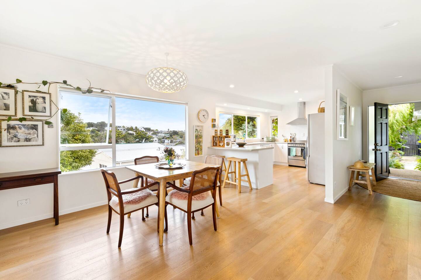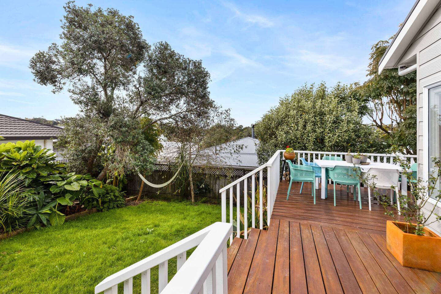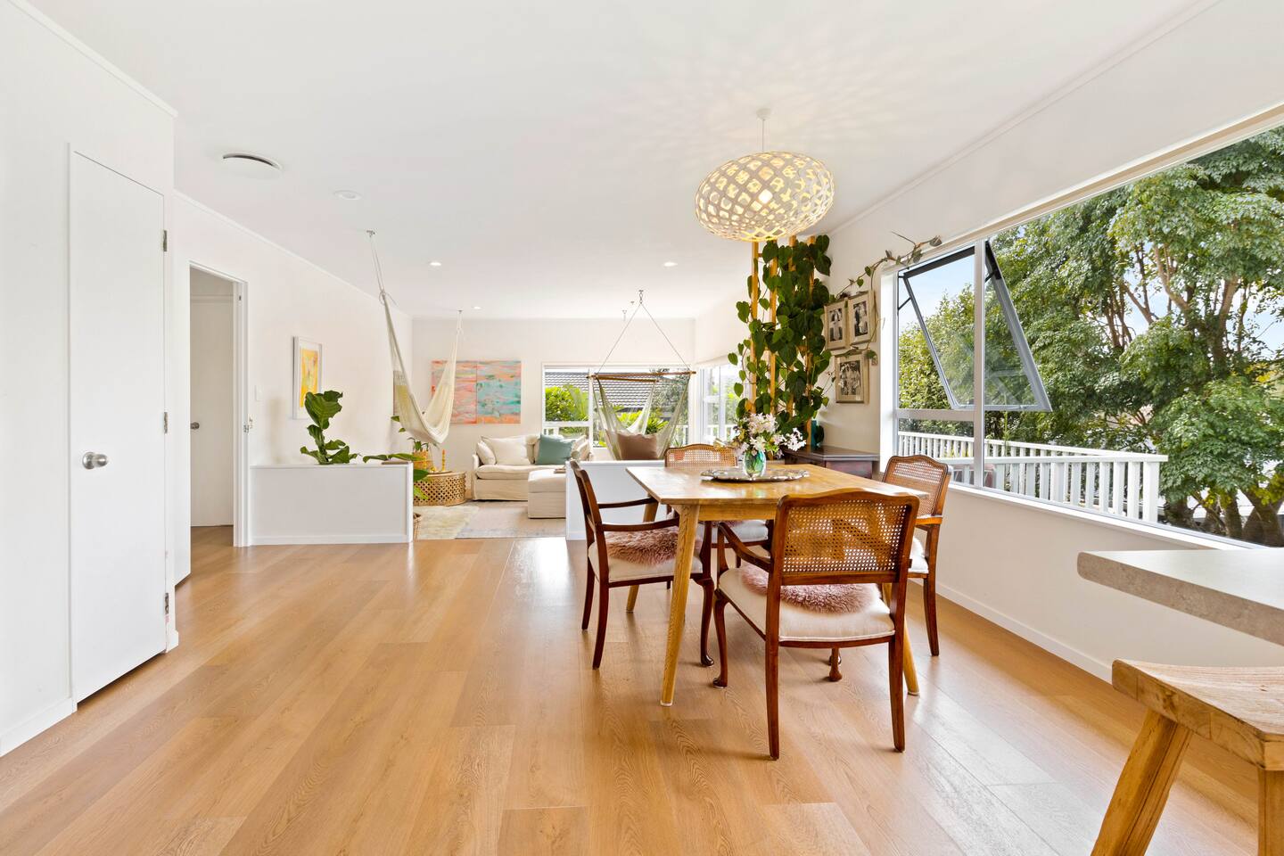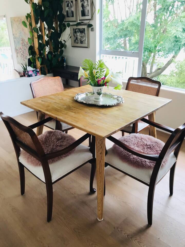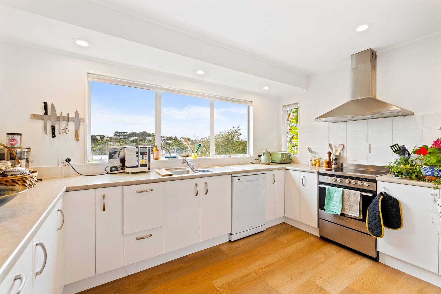 A warm welcome to Peaceful Oasis in the heart of Stanmore Bay! by baybeautifulretreats. This private home has been divided into two separate apartments. The north facing front area of the house is the guest apartment, and Louise lives in the back apartment of the house which has its own separate entrance. Pets (especially dogs!) are most welcome! but please be sure that you take full responsibility for all their home and garden maintenance! The house is spacious and fully set up for short and longterm stays. It can also be hired out, (on a separate hourly basis) and works well for special events, meetings, retreats and classes. Please let us know how we can help you best, to make your stay as exceptional as it could be! The house showcases Louise Taylor Art. All the artwork is for sale, and commissions are welcome, let us know if something interests you. As you can see in the photos we love our mayan silk hammocks and recliner hammock chairs. They are super comfortable. Let us know if hammocks are not your thing and we can easily take them down. Please park directly in the driveway & come in the front entrance. The photos show what to expect, with 2x double bedrooms, single bed, large walk in wardrobe/storage, plus ensuite bathroom, kitchen, dining, living, garden and deck area, and more floor mattresses are available if needed. The queen beds and the single bed are good quality beds & all quite different. The one in the master bedroom is an Innature organic latex and wool mattress, the single bed is a Sleep System pocket springs, and the other queen bed is a pillow top Sierra 2 pocket spring mattress. All very comfortable in their different ways so please choose your comfort! There are 2x foam mattresses for extra guests & 1x portacot. Please note there is only one bathroom which is the ensuite inside the master bedroom. The other bedroom also has to use to this one bathroom. The large linen/hot water cupboard is located in the dining area with modern washing machine inside available only for guests. Other amenities include the smart TV in the living room, and the kitchen is complete with juicer and a Kangen water filter offering good quality filter that takes out impurities & changes the structure of the water to spring water.