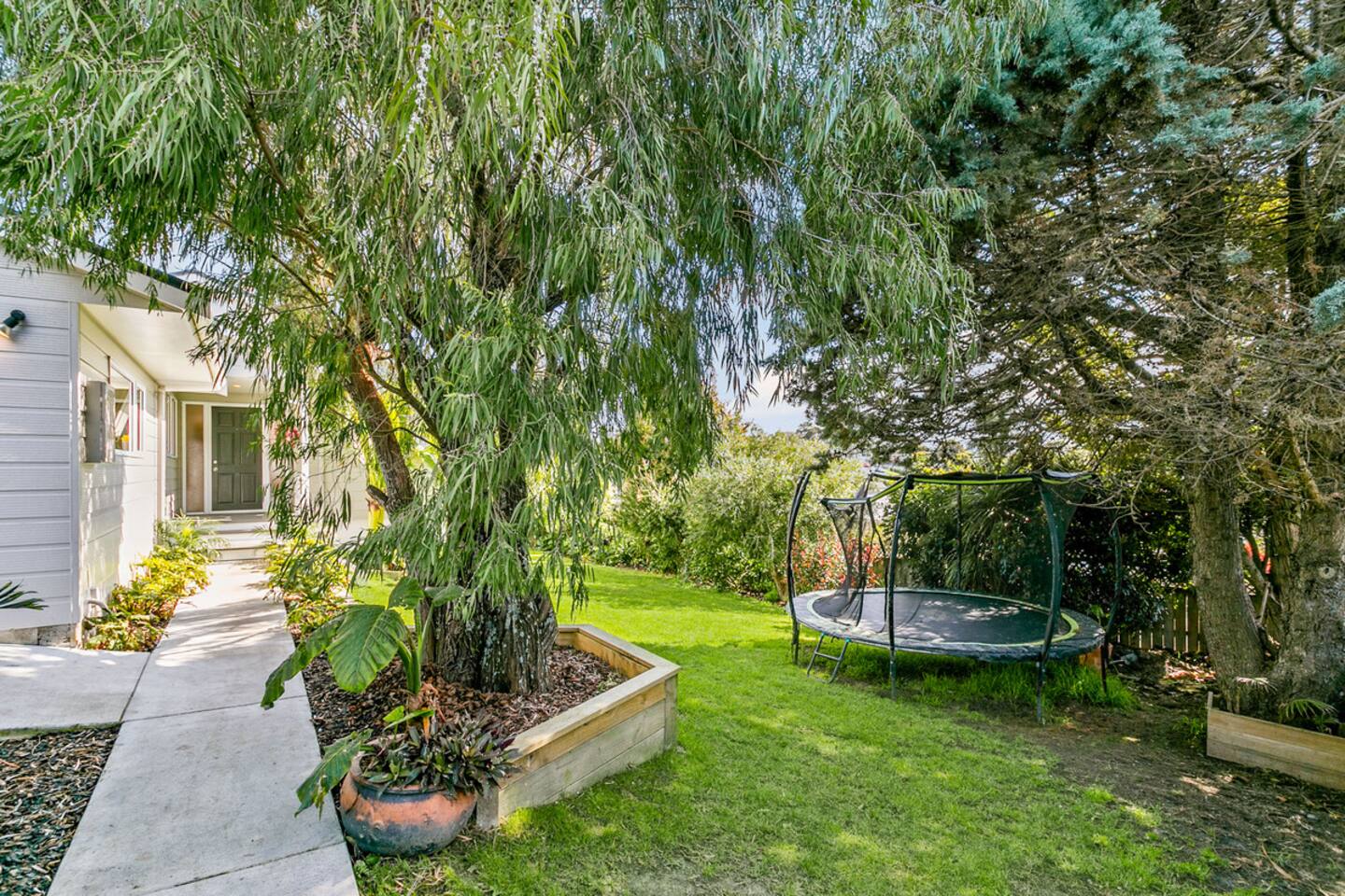 Front door and porch, front yard and trampoline. Entranceway. 2 bedrooms, walk in wardrobe, plus ensuite. Kitchen, dining, living and deck area.